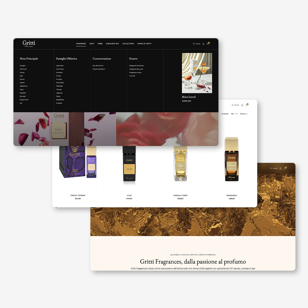 Il progetto per Gritti Fragrances nasce dall’esigenza di rafforzare la presenza digitale del brand, offrendo ai clienti un’esperienza d’acquisto evoluta e immersiva. Al centro del progetto, la creazione di un nuovo e-commerce su Shopify, pensato per esprimere con forza il carattere artistico della maison e garantire autonomia nella gestione dei contenuti editoriali.