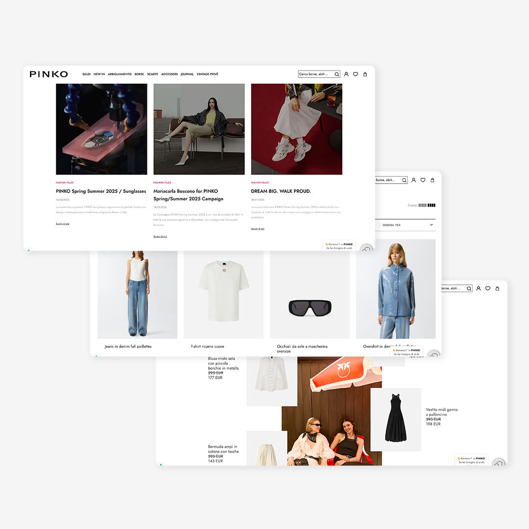 Abbiamo affiancato il brand in modo trasversale, supportando la strategia ecommerce, il piano commerciale e la gestione operativa dell’online store. Sul fronte customer experience, ci occupiamo del servizio clienti pre e post acquisto, per trasmettere in ogni touchpoint l'amore di Pinko per i propri clienti.
